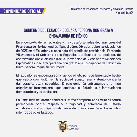 El Gobierno de México exige a Ecuador respetar nuestra soberanía, a no lesionar el Derecho de Asilo y a cumplir con sus obligaciones internacionales, garantizar la inviolabilidad de las misiones diplomáticas y cesar la política de hostigamiento y amedrentamiento. De mantenerse esta situación, México responsabiliza a Ecuador de cualquier afectación a la sede diplomática, a su personal acreditado y a toda persona que se encuentre bajo la protección del Estado mexicano en ese país.