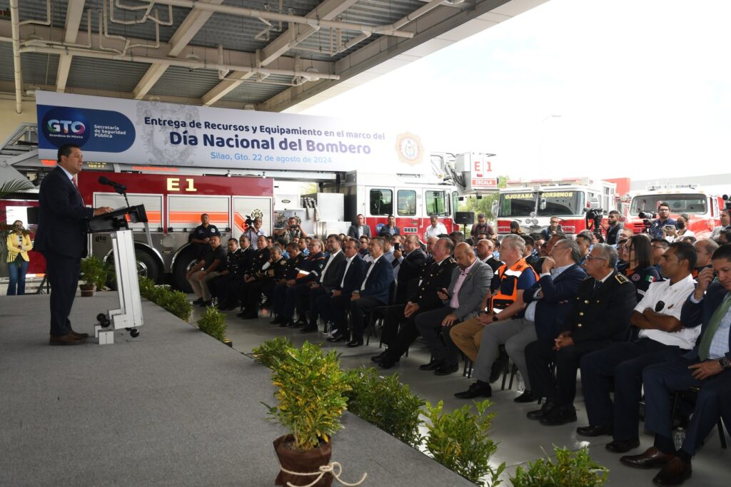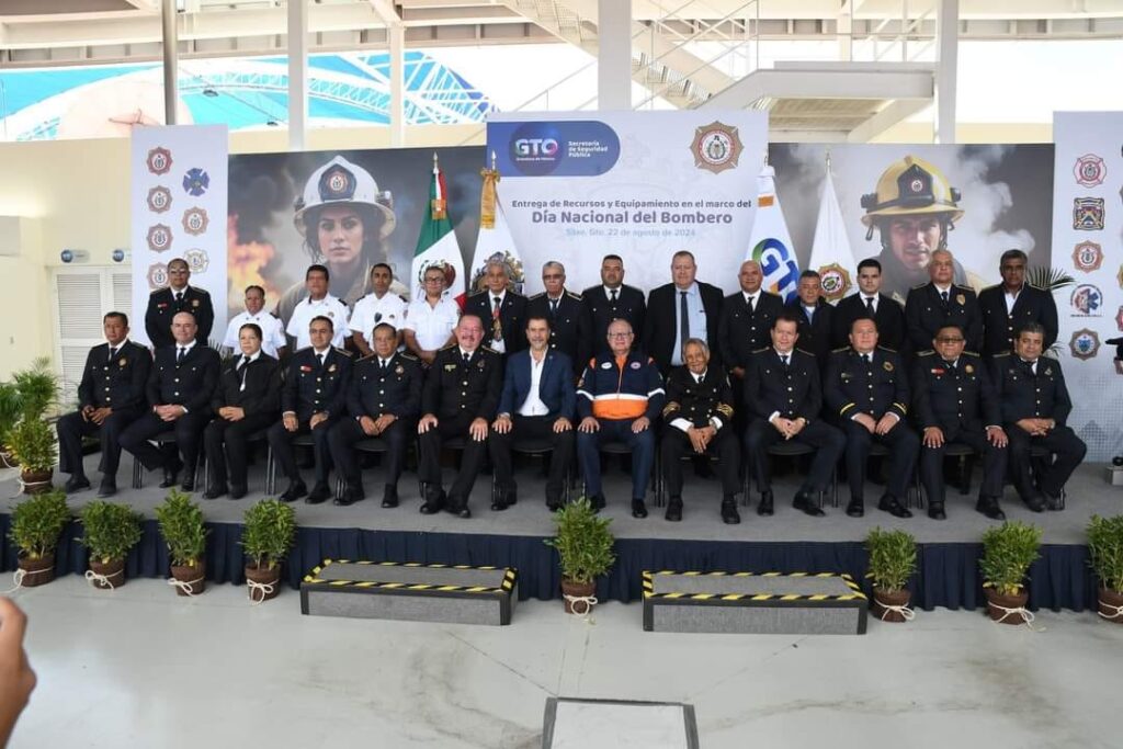 El Gobernador del Estado, Diego Sinhue Rodríguez Vallejo, acompañado del SSPEG Alvar Cabeza de Vaca Appendini, hace entrega de recursos y equipamiento a la Asociación de Bomberos del Estado, en el marco del Día Nacional del Bombero.