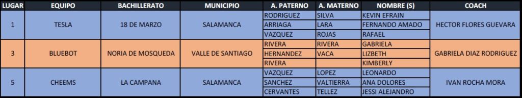 El primer lugar lo obtuvo el equipo TESLA del Bachillerato SABES 18 de marzo de Salamanca, el tercero pertenece al equipo BLUEBOT del SABES Noria de Mosqueda de Valle de Santiago y el quinto lugar fue para el equipo CHEEMS del Bachillerato SABES La Campana de Salamanca.