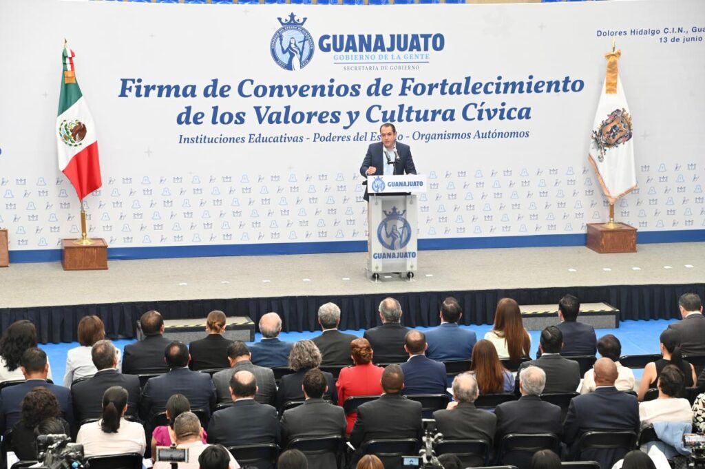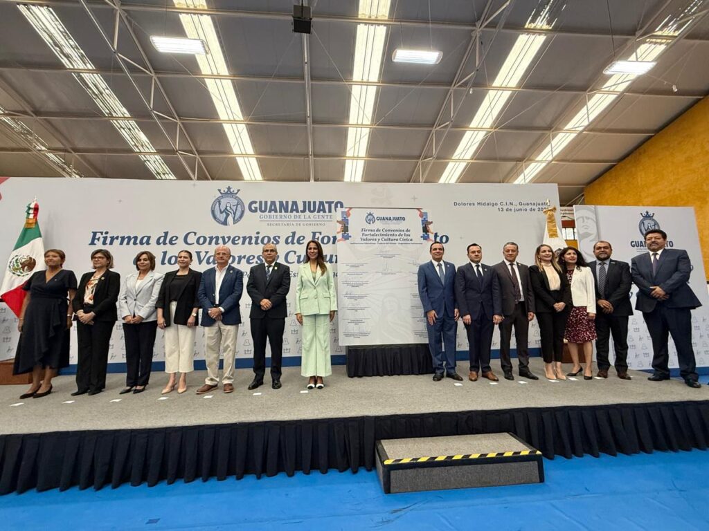 Dolores Hidalgo C.I.N., Gto. La Gobernadora de la Gente, Libia Dennise García Muñoz Ledo, encabezó la firma de acuerdos de colaboración con instituciones educativas, Poderes del Estado y organismos autónomos, con el objetivo de fortalecer la cultura cívica y democrática entre las y los estudiantes de nivel medio superior y superior.