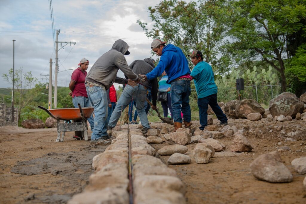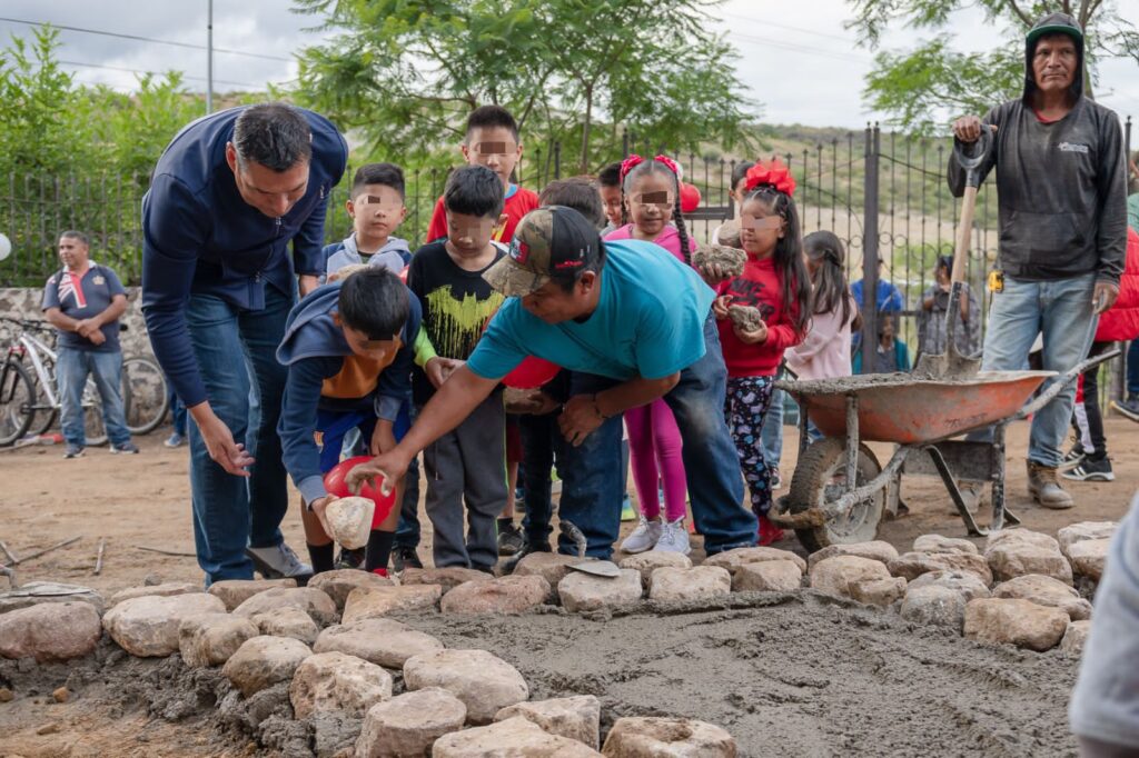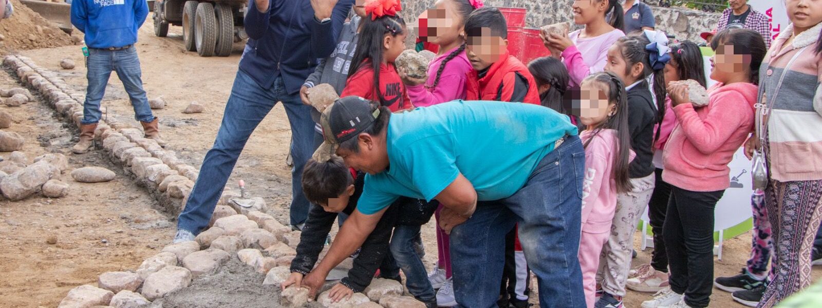 Durante este «corte de listón» que simboliza el arranque de la pavimentación, el edil sanmiguelense fue acompañado por niños de la comunidad, con quienes colocó las primeras piedras de este trayecto, que abarca más de 200 metros y que quedará hecho con piedra ahogada en mortero.