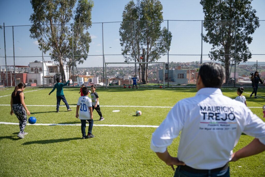 “Aquí hay una cancha de fútbol más, esta cancha la inauguramos hace 11 años, la primera vez que fui alcalde aquí en Infonavit Malanquín, esta cancha ya estaba en pésimas condiciones y acabamos de hacer la rehabilitación, una cancha de fútbol más para todos los que más la necesitan, que son todos los chamacos y más ahora en verano”, expresó Mauricio Trejo.