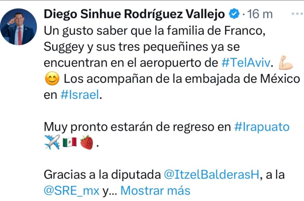 “Un gusto saber que la familia de Franco, Suggey y sus tres pequeñines ya se encuentran en el aeropuerto de #TelAviv. Los acompañan de la embajada de México en #Israel. Muy pronto estarán de regreso en #Irapuato ”, Diego Sinhue.