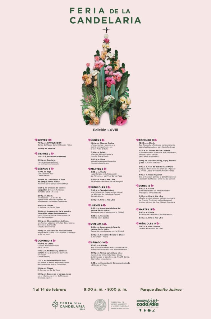 Para esta, la 68.ª edición en este emblemático lugar por segundo año consecutivo, más de 50 viveristas sanmiguelenses y visitantes, expondrán sus plantas, macetas y árboles; además, la Feria de la Candelaria 2024 también tiene un cartel educativo ambiental, a través de la Dirección de Medio Ambiente y Sustentabilidad.