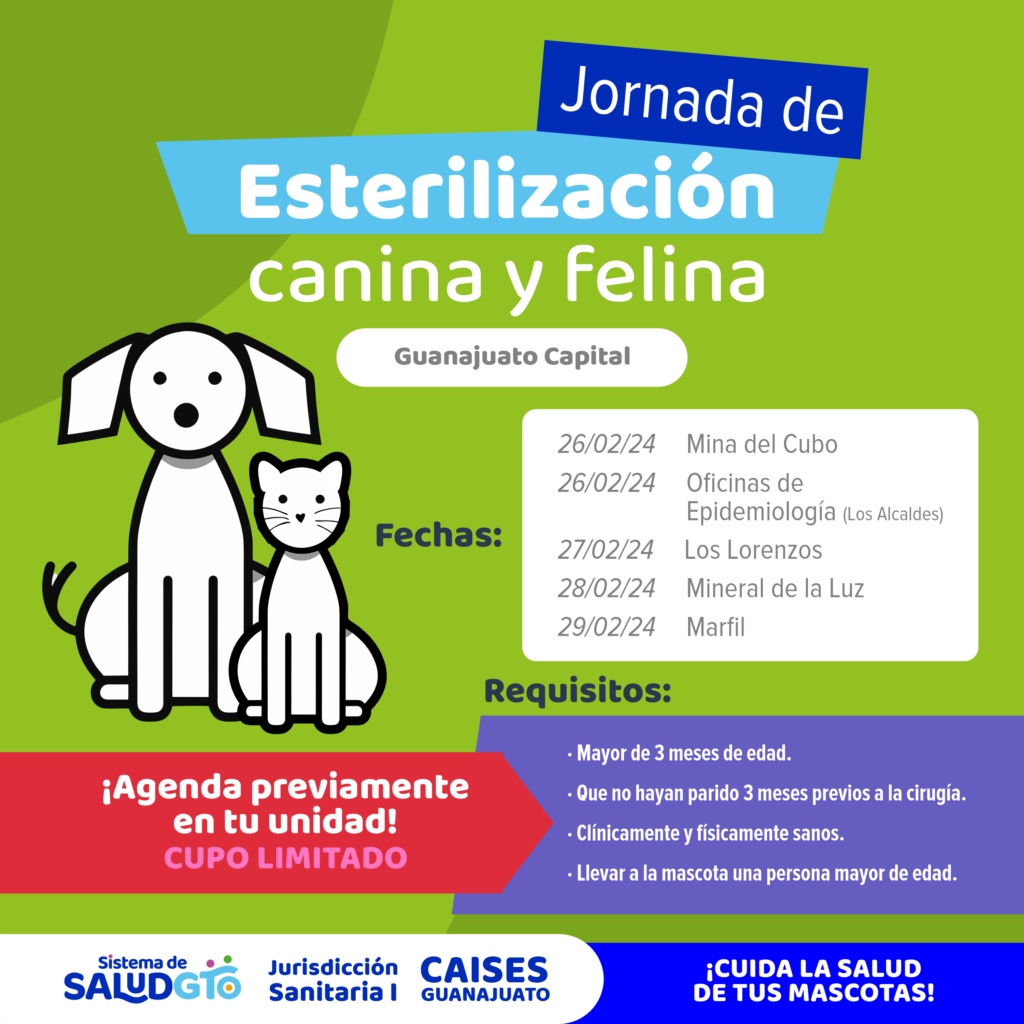 Guanajuato. Guanajuato.- En la búsqueda constante de promover la salud y el bienestar de las mascotas, la Secretaría de Salud de Guanajuato a través de la Jurisdicción Sanitaria I (JSI) de Guanajuato capital realizará una Jornada de esterilización canina y felina durante el mes de febrero en los cinco municipios de la zona.