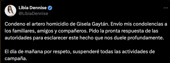 «Condeno el artero homicidio de Gisela Gaytán. Envío mis condolencias a los familiares, amigos y compañeros. Pido la pronta respuesta de las autoridades para esclarecer este hecho que nos duele profundamente. El día de mañana por respeto, suspenderé todas las actividades de campaña».