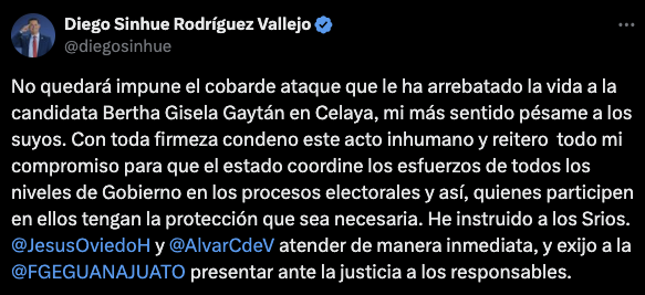 Diego Sinhue Rodriguez Vallejo Gobernador del Estado de Guanajuato en sus redes sociales indicó, «No quedará impune el cobarde ataque que le ha arrebatado la vida a la candidata Bertha Gisela Gaytán en Celaya. mis más sentido pésame a los suyos. Con toda firmeza condeno este acto inhumano y reitero todo mi compromiso para que el estado coordine los esfuerzos de todos los niveles de Gobierno en los procesos electorales y así, quienes participen en ellos tengan la protección que sea necesaria. He instruido a los Srios. Jesus Oviedo y Alvar Caceza de Vaca atender de manera inmediata y exijo a la FGE GUANAJUATO presentar ante la justicia a los responsables.