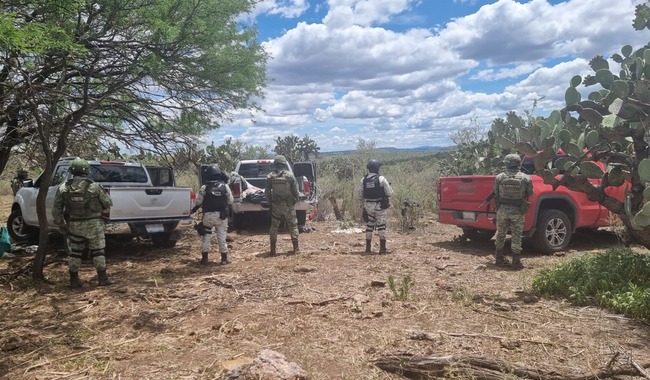 En el marco del Plan Nacional de Paz y Seguridad 2018-2024, en Zacatecas, integrantes de la Guardia Nacional (GN), en coordinación con elementos del Ejército Mexicano, localizaron y destruyeron un campamento clandestino presuntamente utilizado por la delincuencia organizada para ocultar armamento y vehículos.