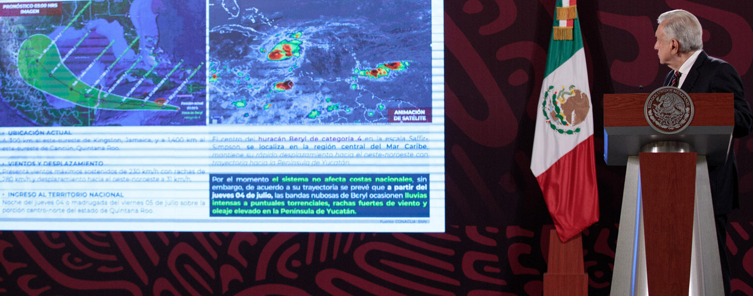 La coordinadora de Protección Civil expuso al presidente Andrés Manuel López Obrador y representantes de los medios de comunicación que Beryl se encuentra en la región central del mar Caribe. Se prevé que impacte la noche del jueves 4 de julio o la madrugada del viernes 5 de julio entre los municipios de Tulum y Felipe Carrillo Puerto.