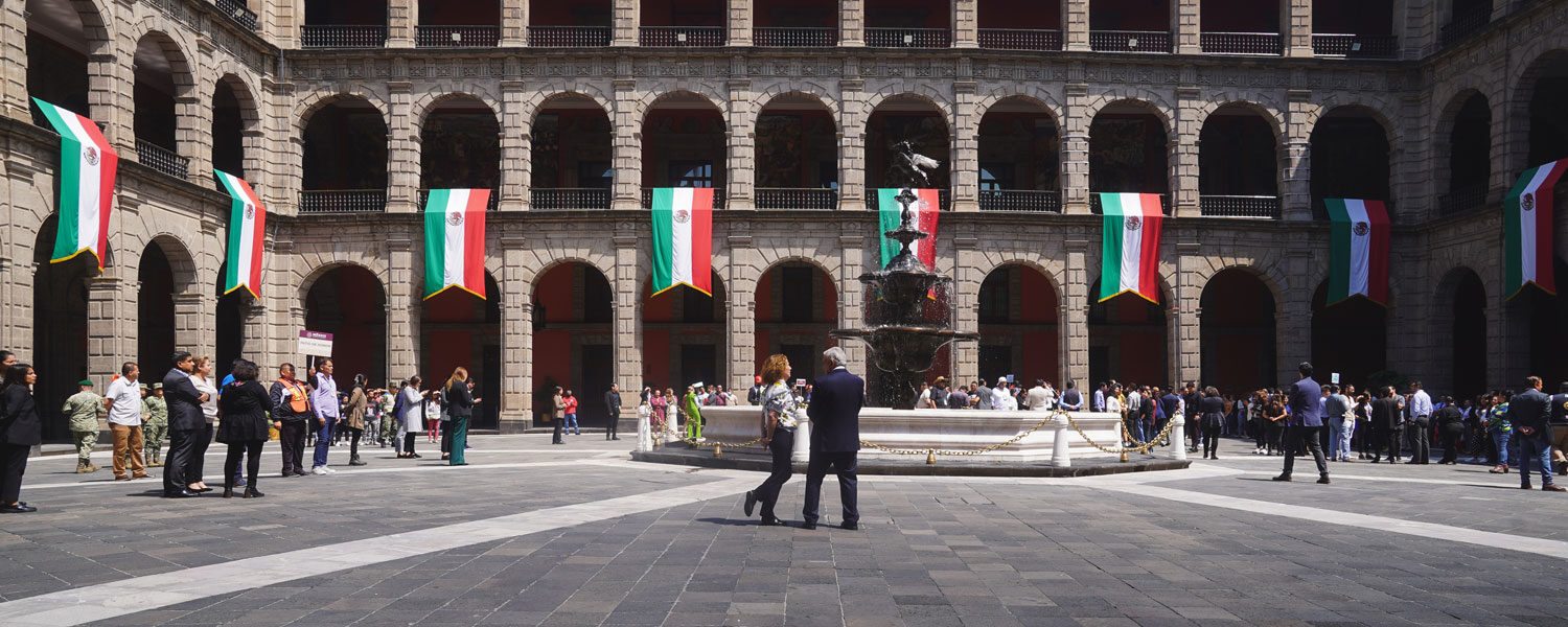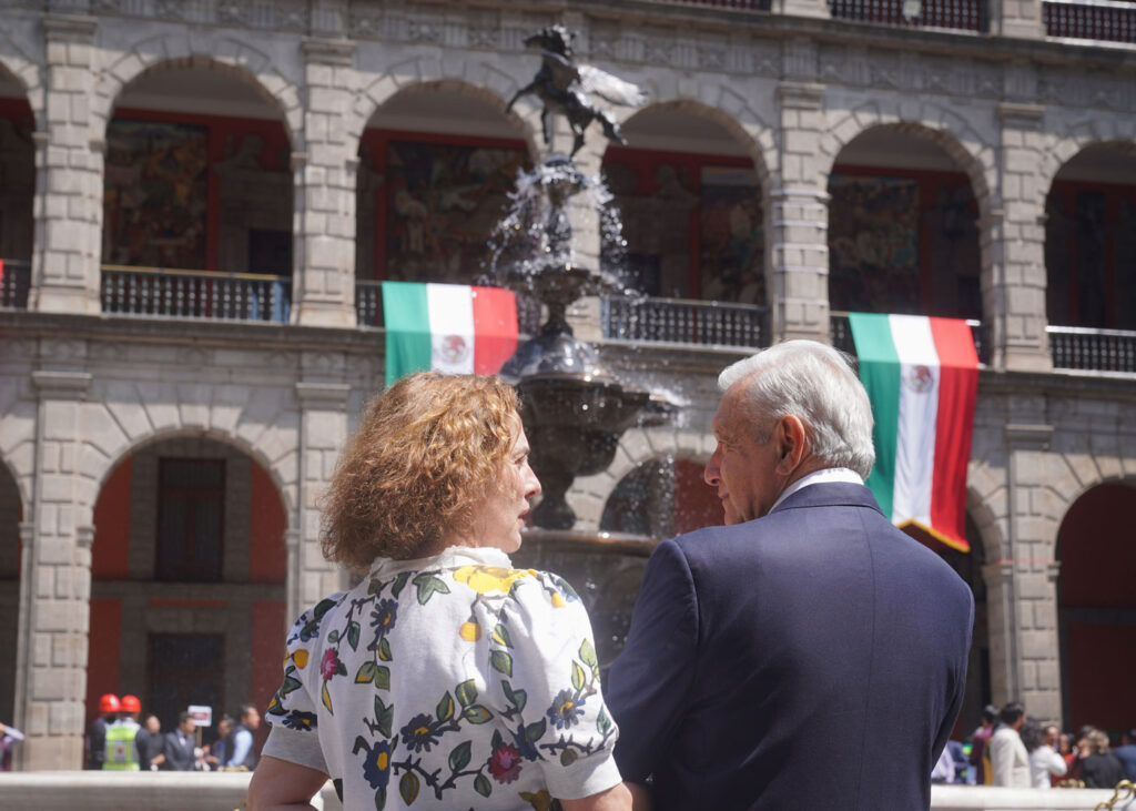 En punto de las 11:00 horas, el mandatario salió del despacho presidencial con dirección a la Fuente de Pegaso, en el Patio Central del Palacio Nacional, donde también se reunieron servidoras y servidores públicos que ahí trabajan.