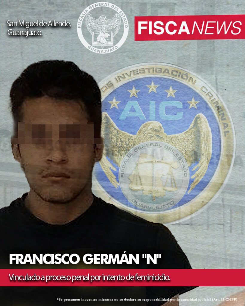 San Miguel de Allende, Gto.- Ha sido detenido un sujeto que apuñaló y golpeó a su ex pareja porque se negó a continuar su relación. La Fiscalía de Guanajuato presentó pruebas que acreditan la agresión y obtuvo vinculación a proceso penal en contra de FRANCISCO GERMAN “N”, por tentativa de feminicidio en la ciudad de San Miguel de Allende.