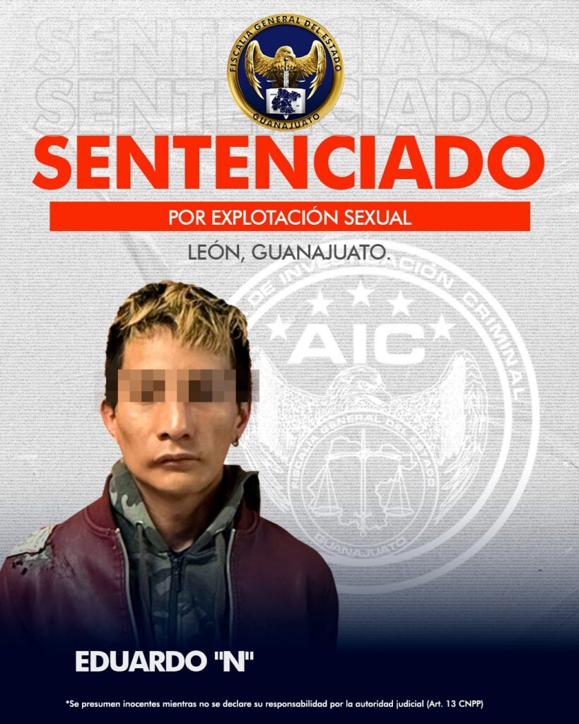La Fiscalía General del Estado de Guanajuato logró obtener con evidencias sólidas, que EDUARDO “N” fuera declarado culpable del delito de Trata de Personas por explotación sexual al obligar a la víctima a prostituirse y beneficiarse económicamente. Además, se le impuso una multa por más de 50 mil pesos.