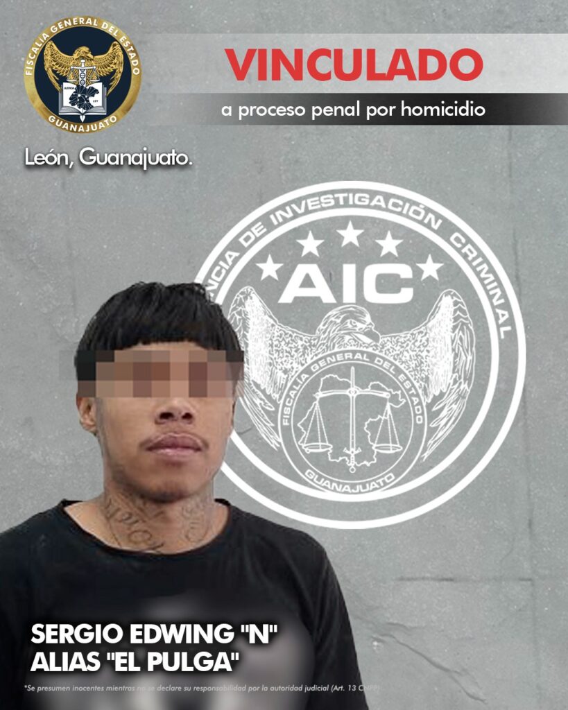 León, Gto.- La Fiscalía de Guanajuato inició una investigación por el delito de homicidio registrado el 28 de septiembre de 2024, en la colonia Vista Hermosa, de la ciudad de León, lo que resultó en la vinculación a proceso penal de SERGIO EDWING “N” alias “El Pulga”, quien se encuentra en prisión como medida cautelar.