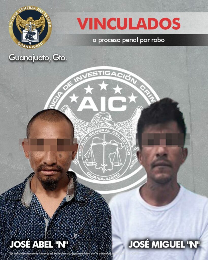 Guanajuato, Gto.- La Fiscalía de Guanajuato cumplimentó orden de aprehensión por el delito de robo en contra de JOSÉ ABEL “N” y JOSÉ MIGUEL “N”, inculpados por asaltar a jóvenes en la ciudad de Guanajuato.